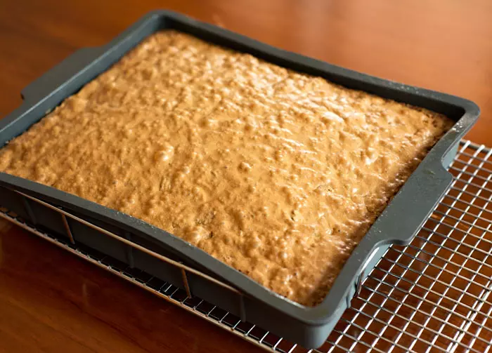 - Turn into a greased 8" x 12" x 2" pan and bake for 40 minutes. Cool in the pan and cut into bars.