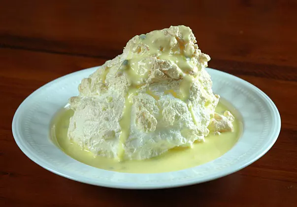 To make the ocean I took that wonderful passionfruit curd and added enough cream to make it soupy and then plopped the meringues in the middle. We each took a spoon and both of us loved it.